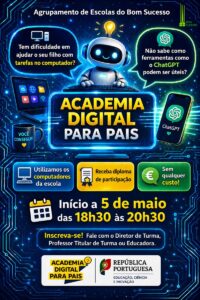O Agrupamento de Escolas do Bom Sucesso informa que se encontram abertas as inscrições para a Academia Digital para Pais, uma iniciativa que pretende apoiar os encarregados de educação no desenvolvimento de competências digitais.