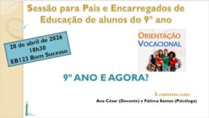 A Escola Básica Integrada 1,2,3 do Bom Sucesso irá promover, no próximo dia 28 de abril, pelas 18h30, uma sessão dirigida a pais e encarregados de educação dos alunos do 9.º ano.