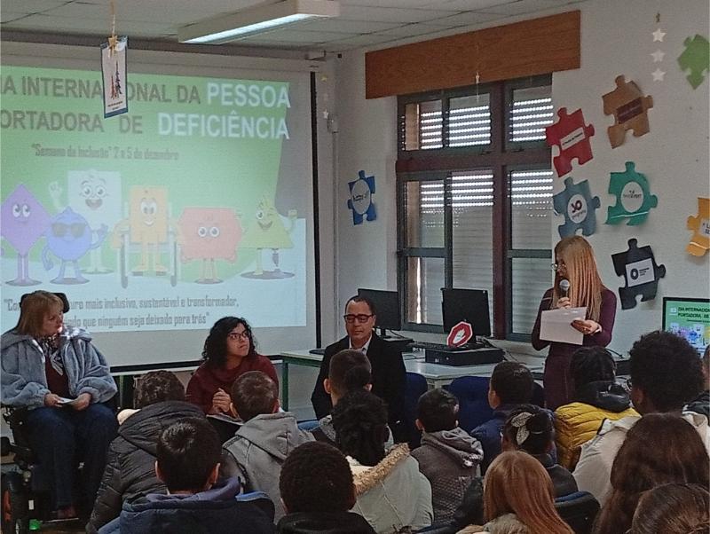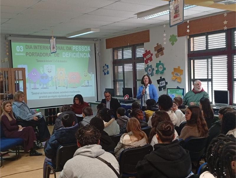 O programa incluiu a sessão “Construir um Futuro Mais Inclusivo, Sustentável e Transformador”, realizado no dia 3 de dezembro, com a participação de uma ex-aluna do Agrupamento, atualmente docente na nossa escola, a professora Beatriz Penelas, que partilhou o seu percurso enquanto pessoa com deficiência motora, contando também com a presença da Vereadora da Câmara Municipal de Vila Franca de Xira, Manuela Ralha e do Presidente da Junta de Freguesia de Alverca do Ribatejo e Sobralinho, Carlos Gonçalves.